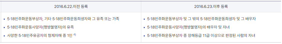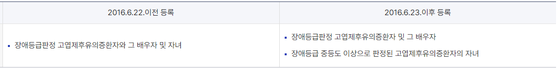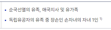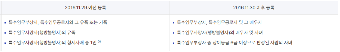 * 특수임무유공자의 배우자 및 자녀가 없고 부모만 있는 경우로서 부 또는 모가 질병이나 장애, 고령 등으로 취업이 어려운 경우에 한함.