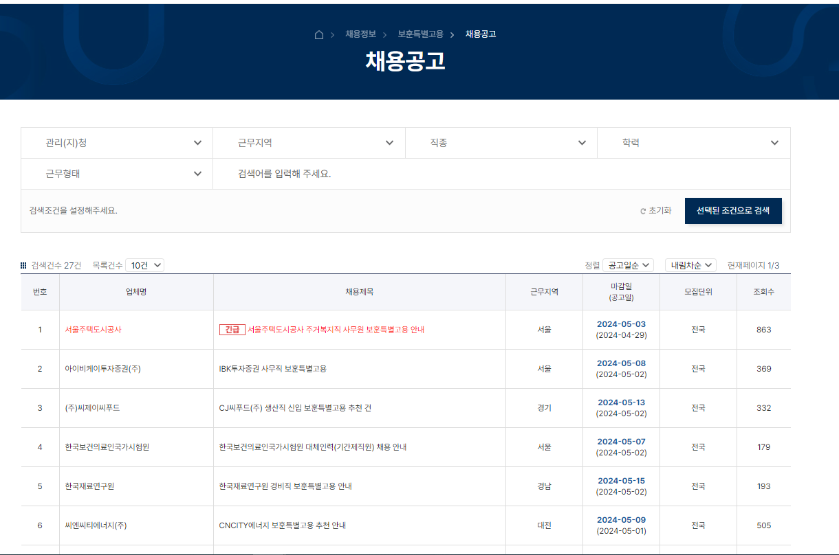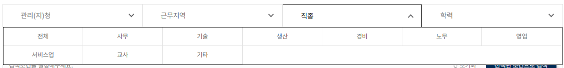 채용공고는 관리지청, 근무지역, 직종, 학력, 근무 형태등을 선택한 후 조건에 맞게 조회도 가능해요.