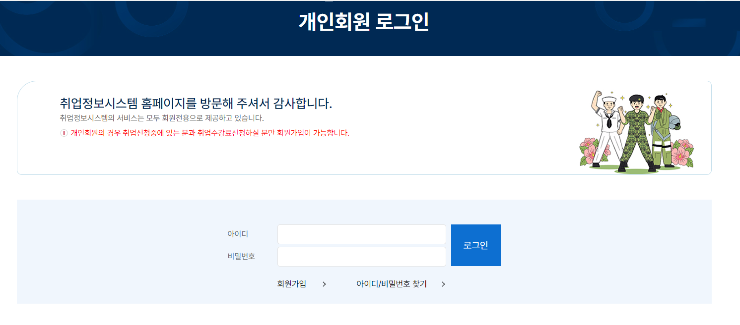 국가보험처 취업정보시스템 홈화면 우측 상단에 있는 개인회원로그인 또는 회원가입을 눌러주세요.