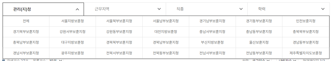 채용공고는 관리지청, 근무지역, 직종, 학력, 근무 형태등을 선택한 후 조건에 맞게 조회도 가능해요.