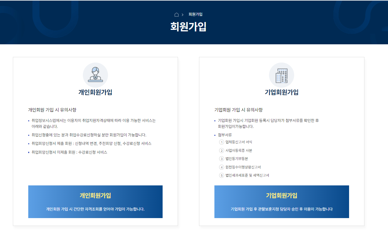 개인회원가입/기업회원가입 선택화면이 나옵니다. '개인회원가입' 눌러주세요.