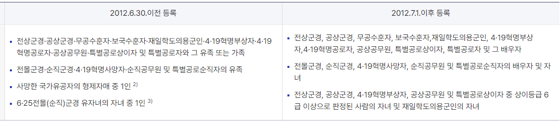 * 특수임무유공자의 배우자 및 자녀가 없고 부모만 있는 경우로서 부 또는 모가 질병이나 장애, 고령 등으로 취업이 어려운 경우에 한함.