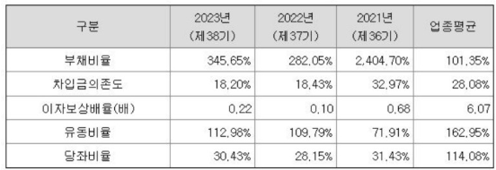 2023년에는 전년 대비 부채가 2배 이상 증가한 걸 확인할 수 있는데, 차입규모가 부담스러울 것으로 보입니다.